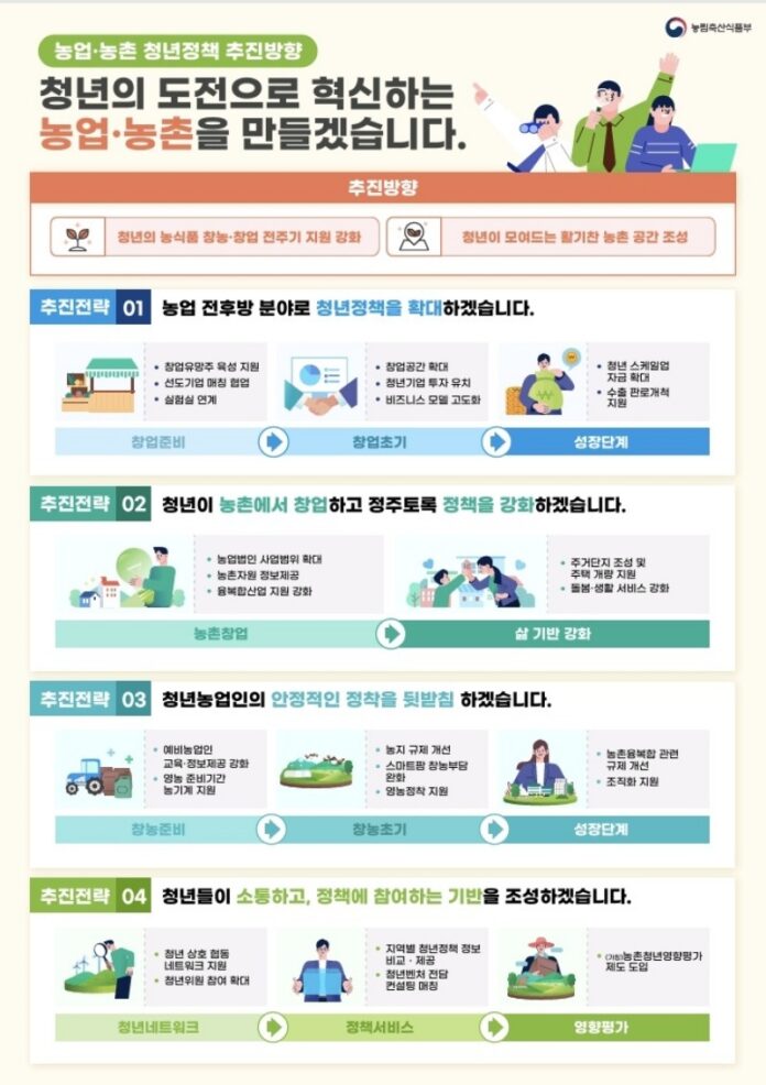 청년의 아이디어와 현장의 목소리를 기반으로 마련한 이번 대책은 ▲농업·농촌 청년정책의 범위를 기존 농업 생산 중심에서 농식품산업 가치사슬 전 분야로 확대 ▲자유로운 청년창업을 저해하는 규제 혁파 ▲정책과정에서 청년의 주도적 역할 강화 등 3대 청년정책 추진방향을 설정했다.